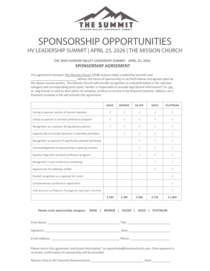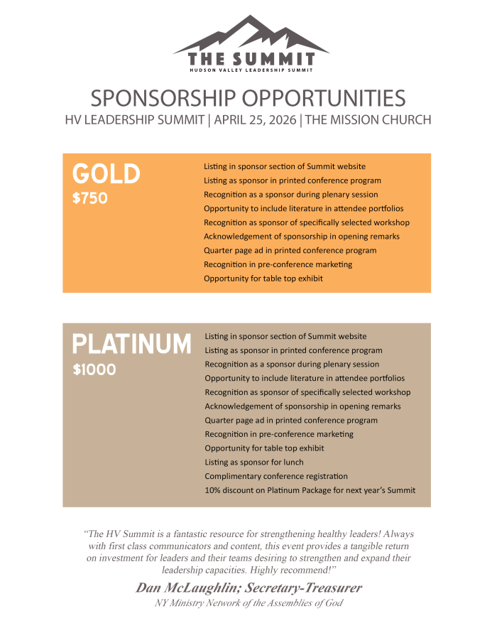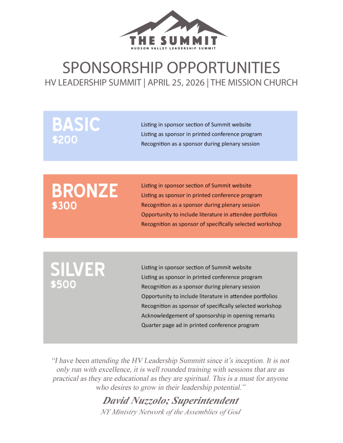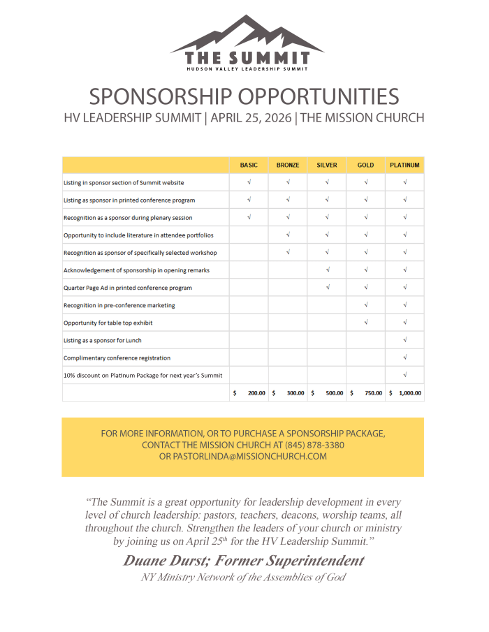 Sponsorship of the 2026 HV Summit is certain to deliver increased awareness, brand recognition and the opportunity to gain exposure in your target market. It’s a great way to create visibility and interest in your organization while driving potential clients to your website. Contact pastorlinda@missionchurch.com for more information.